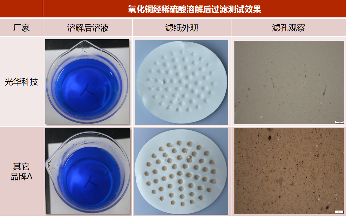 光華科技氧化銅溶解后,鍍液中不溶性物質少,可減少銅層粗糙