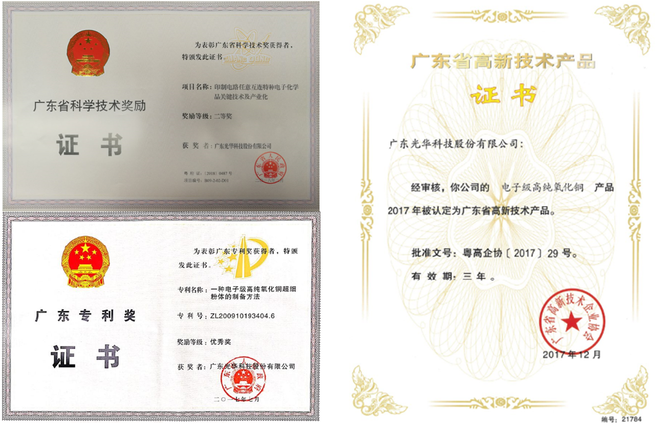 憑借雄厚的研發實力、先進的生產技術、獨特的制備方法和優異的性能指標,光華科技高純電子級氧化銅曾獲得美國授權專利證書,并獲得由政府單位評定的榮譽資質——由廣東省知識產權局頒發的“廣東省專利銀獎”、由廣東省人民政府頒發的“廣東省科學技術二等獎”、由科學技術部頒發的“國家重點新產品”等多項獎勵與稱號。今年中國品牌日,光華科技高純電子級氧化銅又再次獲得美譽,成功入選“國貨新品”目錄。這是對光華科技電子級氧化銅一個有分量的肯定,也充分體現了光華科技不斷滿足客戶需求和市場發展,對產品技術迭代升級與創新的不懈追求。